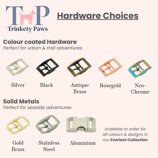For retailers serving coastal areas or customers whose dogs regularly swim in the sea, we also offer an Everlast Range upgrade. This features premium stainless steel, gold brass, or aluminium hardware, all of which provide enhanced resistance to saltwater corrosion and can significantly extend the lifetime of the product.