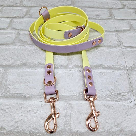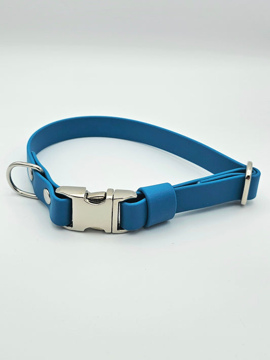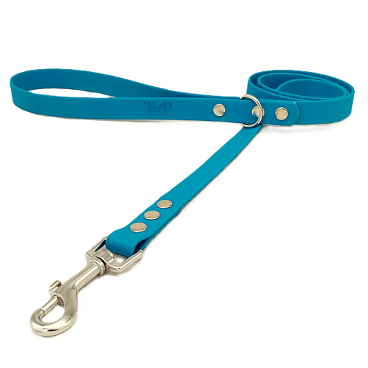 Our standard BioThane® collars and leads come fitted with colour-coated zinc die-cast hardware, which is strong, lightweight, and perfectly suited for everyday use, lake swims, mud and puddles.