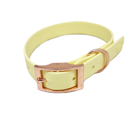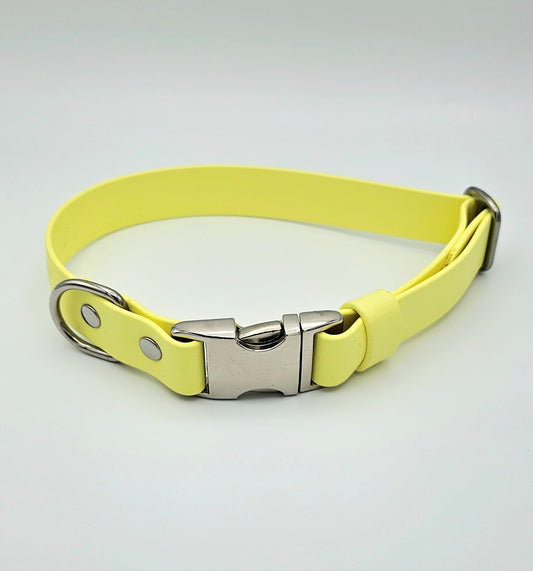 Our standard BioThane® collars and leads come fitted with colour-coated zinc die-cast hardware, which is strong, lightweight, and perfectly suited for everyday use, lake swims, mud and puddles.