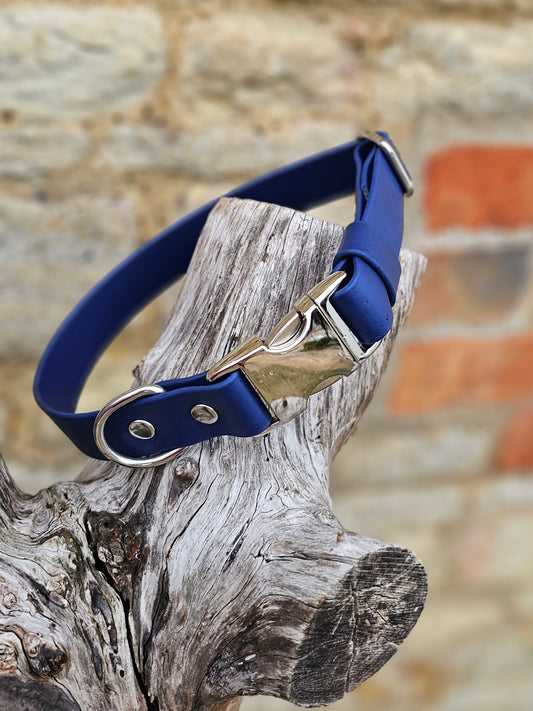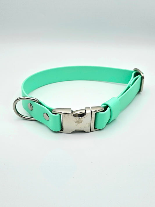 Our standard BioThane® collars and leads come fitted with colour-coated zinc die-cast hardware, which is strong, lightweight, and perfectly suited for everyday use, lake swims, mud and puddles.