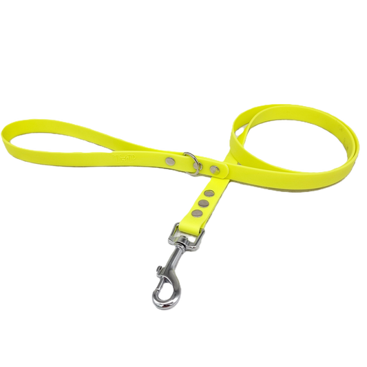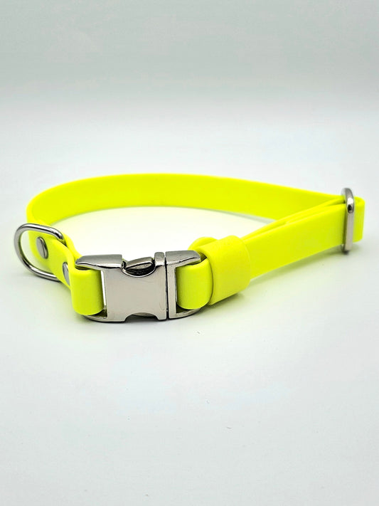 Our standard BioThane® collars and leads come fitted with colour-coated zinc die-cast hardware, which is strong, lightweight, and perfectly suited for everyday use, lake swims, mud and puddles.