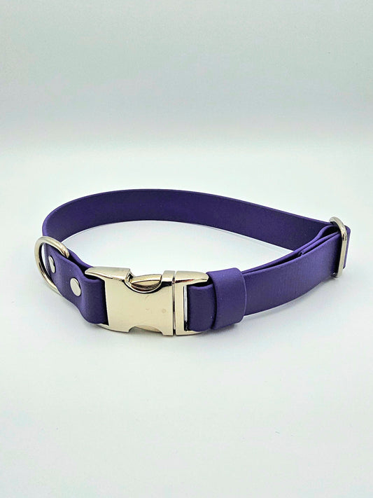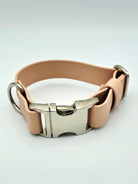 Our standard BioThane® collars and leads come fitted with colour-coated zinc die-cast hardware, which is strong, lightweight, and perfectly suited for everyday use, lake swims, mud and puddles.