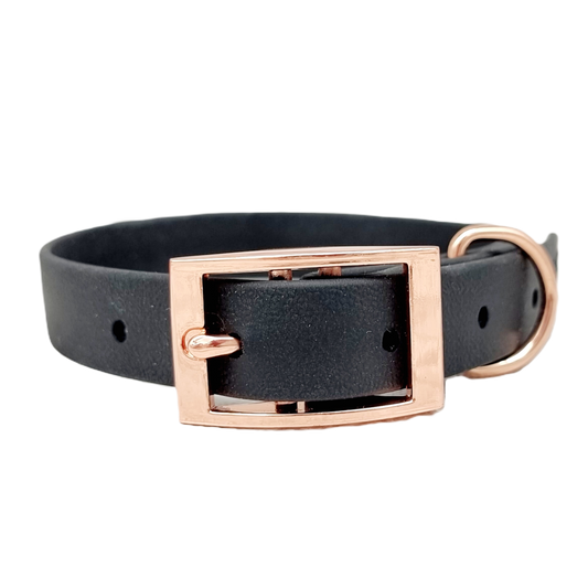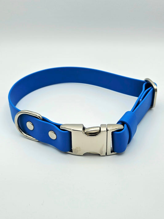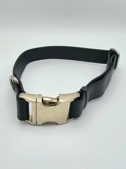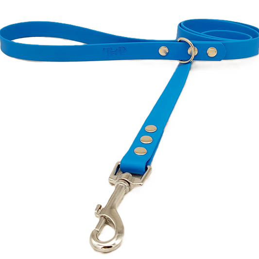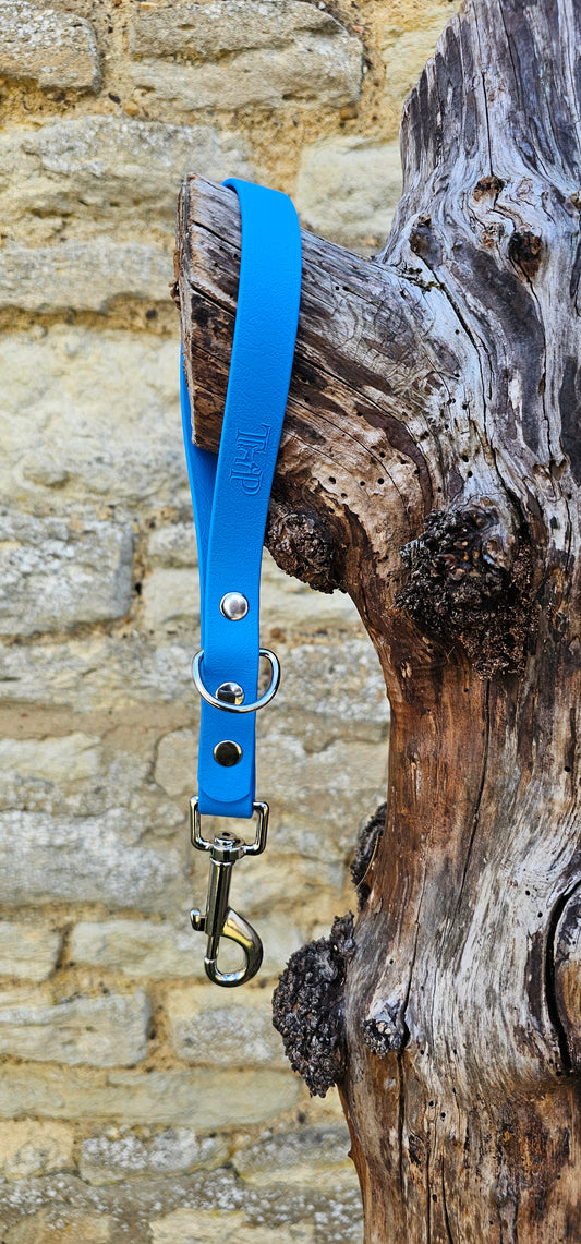 Our standard BioThane® collars and leads come fitted with colour-coated zinc die-cast hardware, which is strong, lightweight, and perfectly suited for everyday use, lake swims, mud and puddles.
