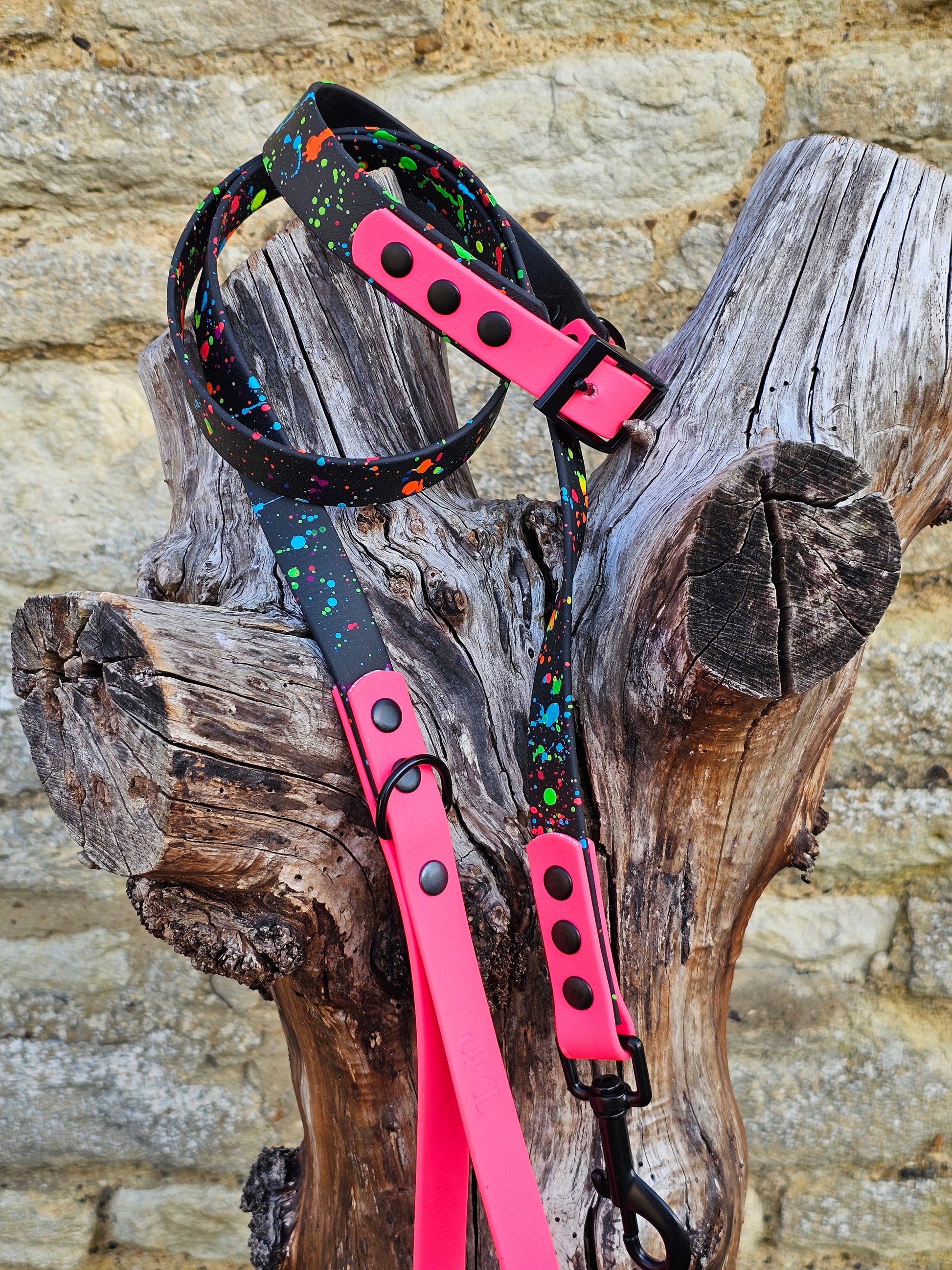 Each Neon Splatter Product features bold neon colour accents and our Bundle contains our bestselling four Neon accent shades, paired with our black Biothane backing strap that’s splattered with a multicoloured neon splashy design to create this amazing colour popping effect on every product.
